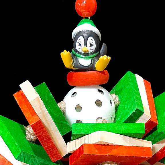 Four legs of pine slats strung on jute cord from a perforated golf ball with a cute penguin seated on top. The base of this toy is nickel plated chain. Designed for intermediate to medium sized birds such as quakers, caiques, ringnecks, senegals, african greys and other birds that love pine wood slats.